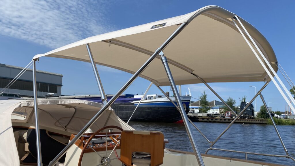 Met heel warm weer is het prettig om niet in de brandende zon te hoeven zitten, zeker op het water met de zon van twee kanten. Om de zon van boven te weren zou u kunnen denken aan een bimini. De bimini kunnen wij naar uw wensen op maat maken, dit kan op een bestaand maar ook op een nieuw rvs frame. Ook hier zijn diverse mogelijkheden, denk bijvoorbeeld aan: